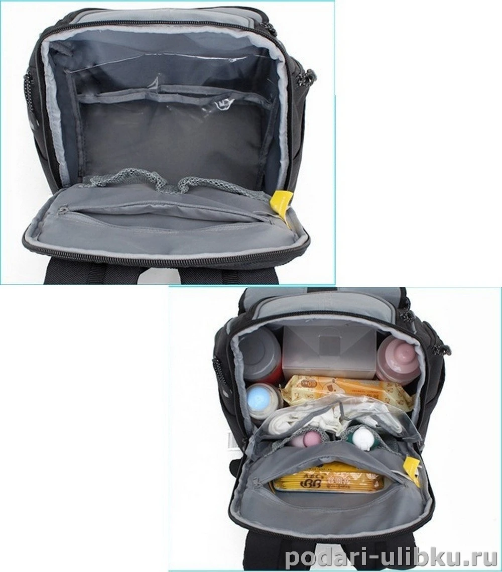 В рюкзаке много разных отделений и карманов, что поможет разместить необходимые для малыша вещи в порядке и максимально компактно.