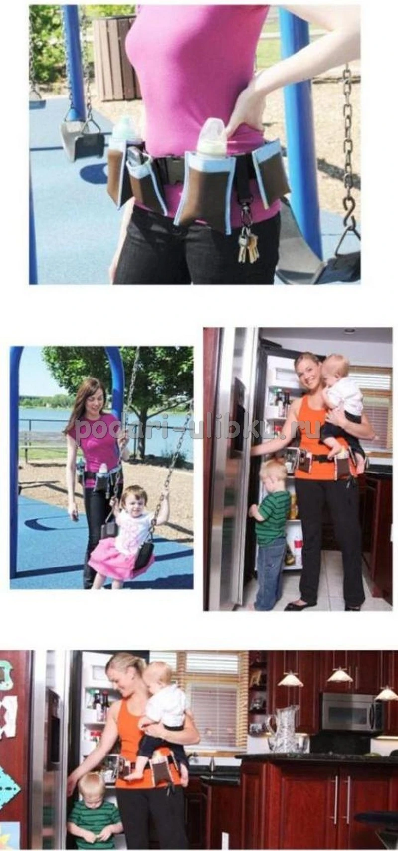 Если вы не хотите носить с собой на прогулку с малышок сумку, даже маленькую, мы предлагаем решение для вас. Самое необходимое:бутылочка, памперс, салфетки, мобильный, всё это с лёгкостью разместиться в 4-х кармашках, а на карабин можно повесить ключи. И ваши руки будут свободны для вашего малыши.