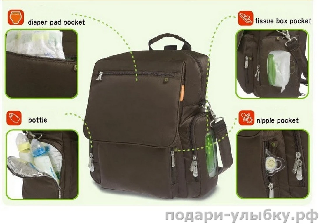 Сумка универсальна, её можно носить в руке, за наплечный ремень или как рюкзак. Сумка-рючказ вместительна, а благодаря большому количеству отделений и карманов, все необходимые вещи будут разложены удобно и содержаться в порядке. Даже для пустышек, подгузников и салфеток есть свои карманы. Для влажных салфеток предусмотрен карман с пластиковым контейнером, чтобы они всегда был под рукой, а для пустышки небольшой кармашек, где её легко будет найти.
